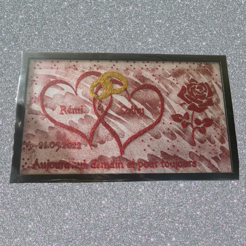 Cadre mariage personnalisé avec le prénom des mariées la date et la phrase qui leur ressemble ainsi que la rose et le cœur d’alliance.